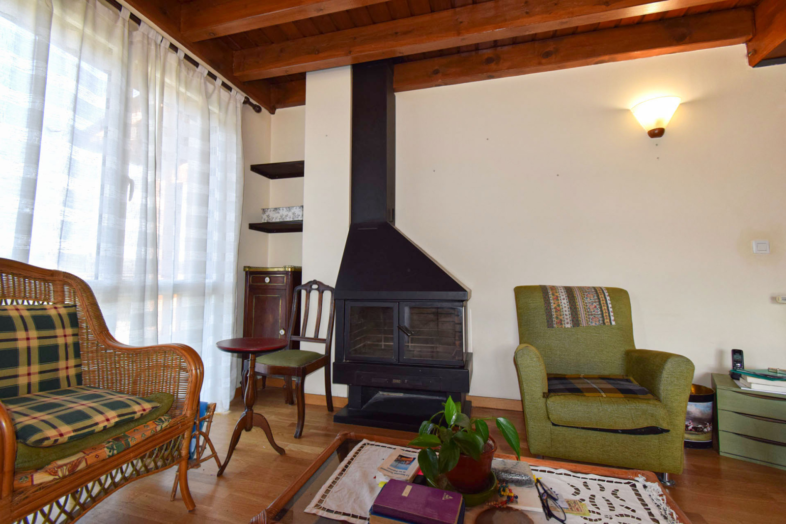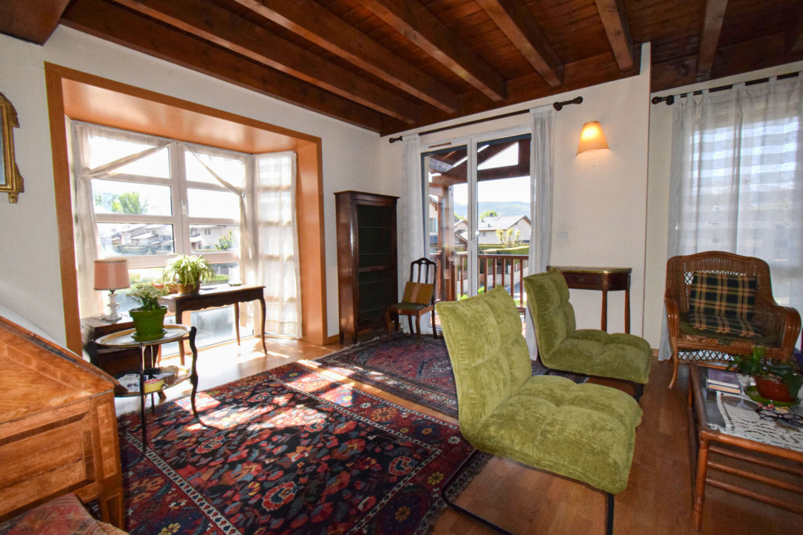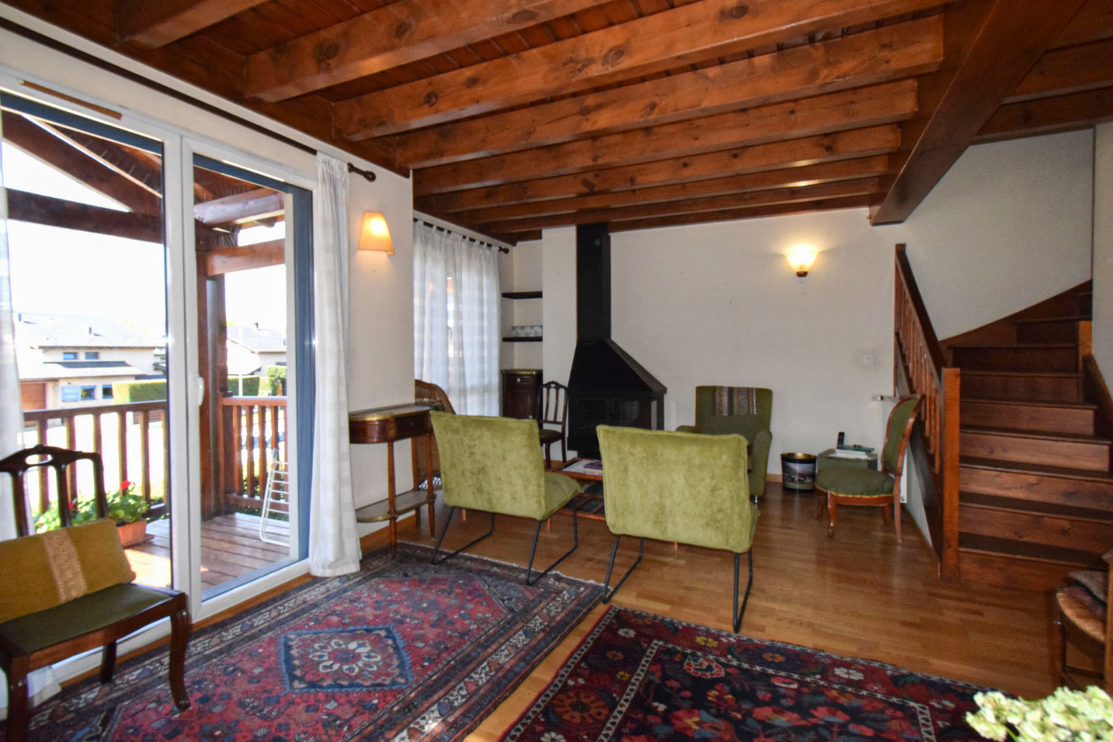 Quartier résidentiel "les Planes de Surroca", appartement moderne en 1er étage, de type duplex, comprenant hall d'entrée avec placard et lavabo/wc de courtoisie, cuisine séparée équipée, salle de séjour superbement exposée, très lumineuse, bow-windows à l'est et terrasse couverte de 5m2 plein sud, cheminée insert bois; A l'étage, dégagement sur 3 chambres, 1 double, 2 simples, salle de bains avec wc; Chauffage central et eau chaude par chaudière gaz individuelle; Garage privatif type box de 17m2 et stationnement libre. Proche centre village avec toutes commodités à pied.Toujours bien entretenu, belle opportunité, vendu sans mobilier.