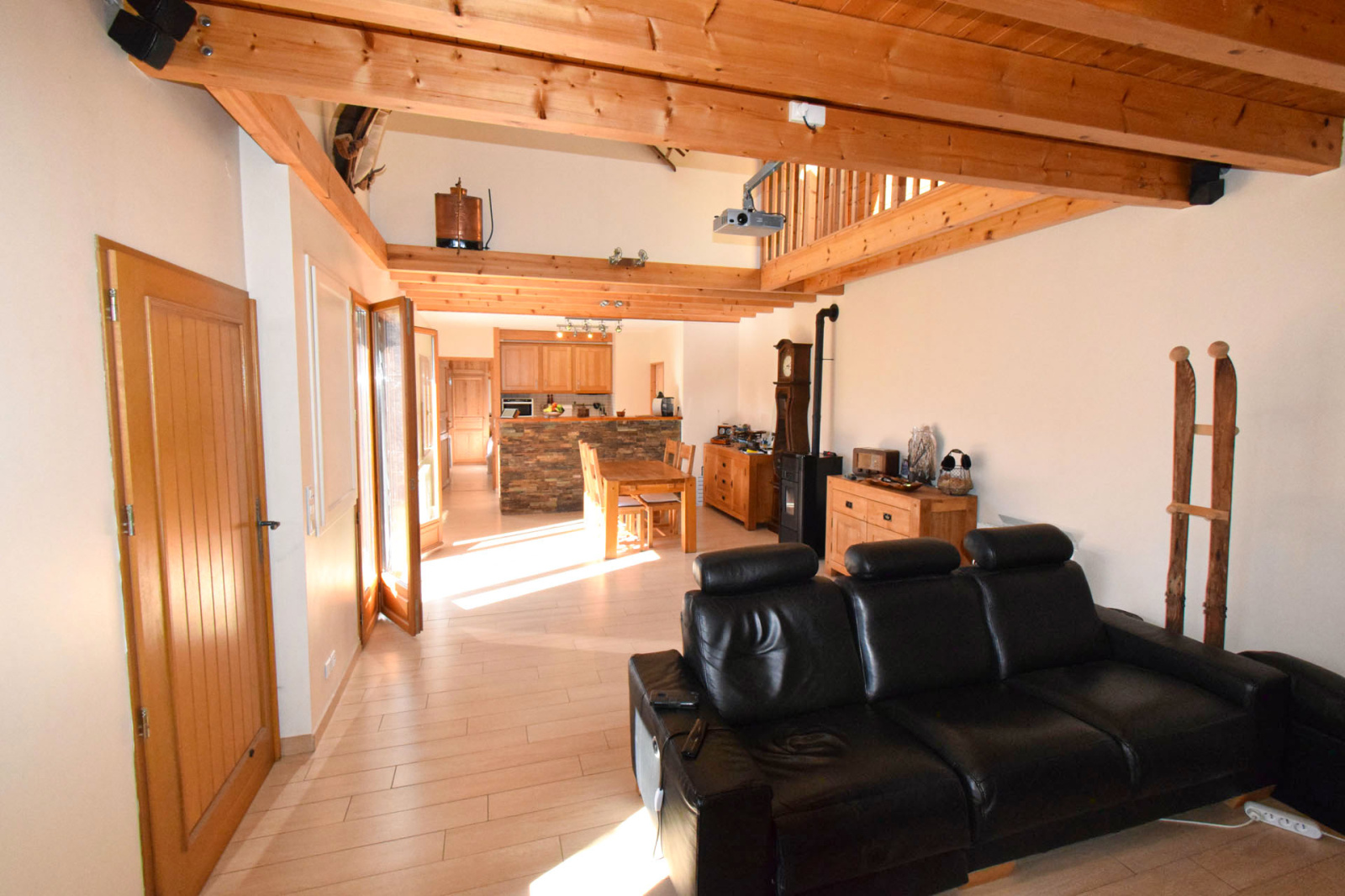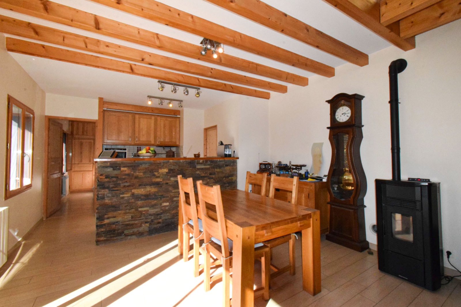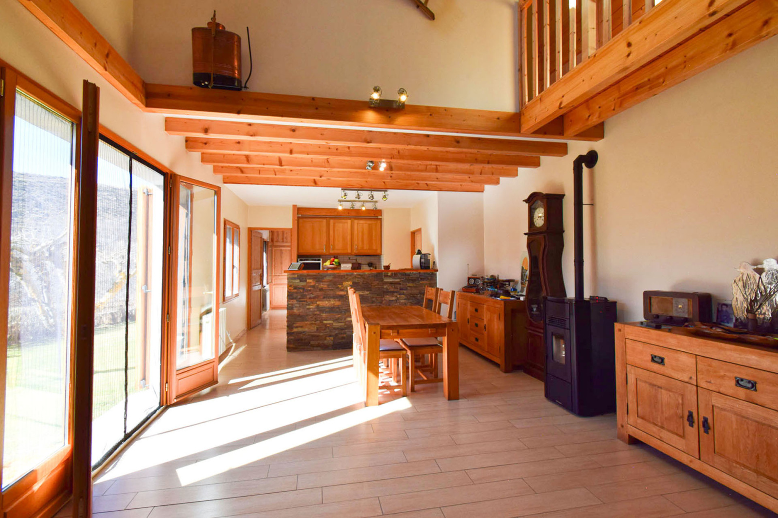 Maison 4 faces réformée en 2008, atypique, à Angoustrine, sur une belle et grande parcelle à plat de 650m2, avec jardin d'agrèment, arboré, et dépendances, offrant tout le confort moderne; En rez de chaussée, entrée sur une grande salle de séjour avec cuisine ouverte, l'ensemble d'env. 46m2, cheminée insert bois et poêle granulés complémentaire, très lumineuse avec ses ouvertures principales en expo sud ouest, 1 chambre double type suite avec salle de douche et wc, du salon porte de service vers garage de 27m2 avec porte sectionnelle motorisée; Au 1er étage, dégagement sur une mezzanine surplombant le salon, 2 chambres doubles avec velux, 1 salle de bain avec wc; Facile d'accès, grand garage de 27m2, jardin avec arrosage automatique, 2 remises de 24 et 15m2 pour stockage divers...Le tout en très bon état, opportunité à saisir.